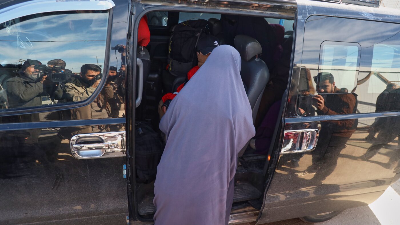 Family members of suspected Islamic State militants who are Australian nationals board a van heading to the airport in Damascus during the first repatriation operation of the year, at Roj Camp in eastern Syria, Monday, Feb. 16, 2026. Thirty-four Australian citizens from 11 families departed the camp.